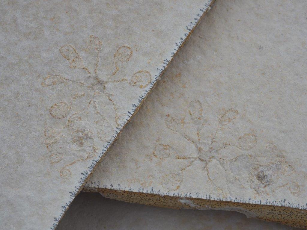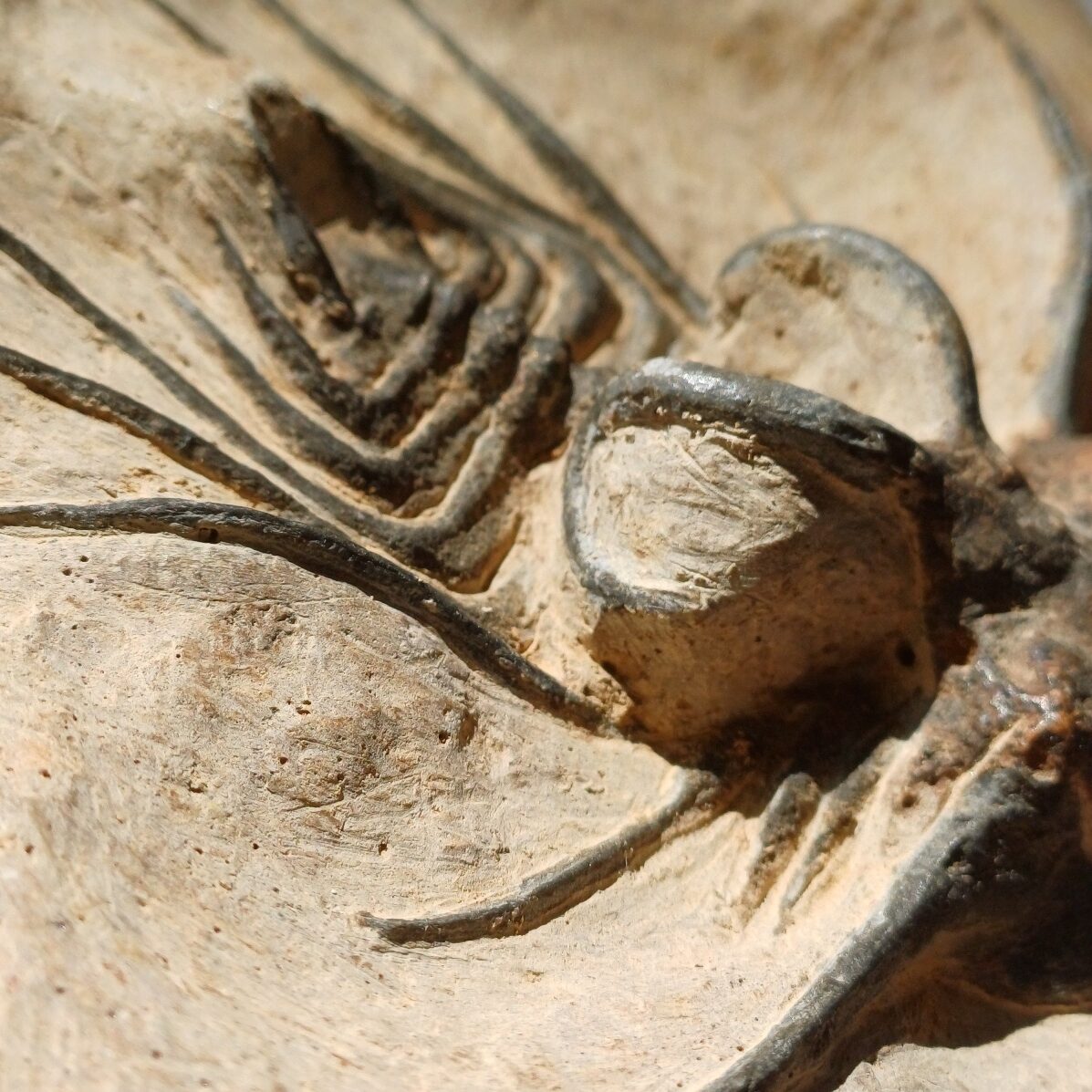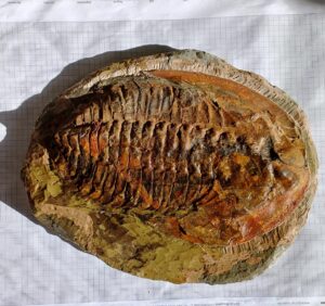 marokkanische Fossil-Komposition eines Cambropallas. Der nasse Zustand der einen Seite zeigt die Mischung verschiedener Materialien für die Matrix sowie Malereien in Randgebieten