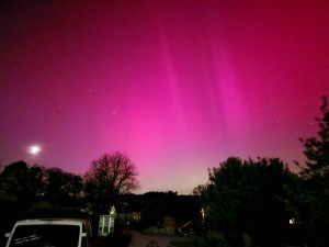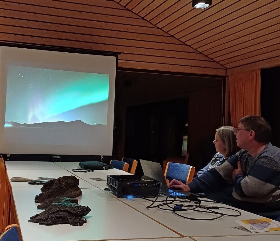 Der Himmelfahrtsdonnerstag und der darauffolgende Freitag standen ganz im Zeichen der Meteoritenkrater. In einem aktiven Suevitsteinbruch (Aumühle), in diversen Aufschlüssen und Klopfplätzen wurden bunte Brekzie, Suevite verschiedener Farben und Körnungen, Flädele, geschockte Fossilien und Fluss- bzw. Kraterseesande mit winzigen Schnecken gesucht. Ein ganz großes Dankeschön an Andreas Dosche, der uns mit seinem gewaltigen Fachwissen führte und dabei doch immer locker und unterhaltsam blieb! Auch ein Besuch der beiden Museen, des RiesKraterMuseums in Nördlingen und des Meteorkratermuseums in Steinheim durften nicht fehlen. Wie bestellt gab es zum Abschluss dieses Teils der Exkursion ein weiteres himmlisches Ereignis: Polarlichter, wie sie so deutlich und so weit südlich selten zu erleben sind!